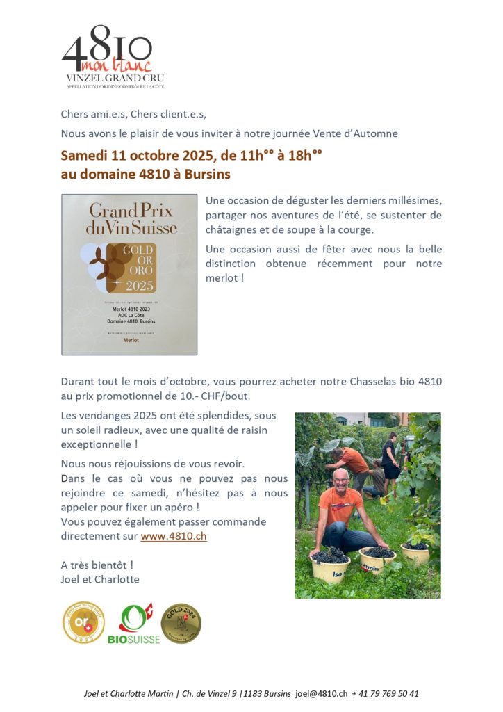 On se réjouit de vous accueillir au Domaine 4810 pour partager quelques chataîgnes de la forêt de Bursins, la soupe des courges de Louis, et déguster nos vins !!!